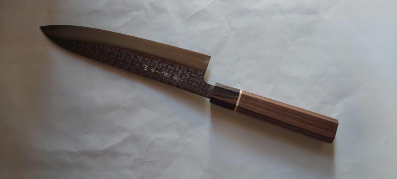 ホーム > 包丁 田中特製田中特製「吹雪牛刀210mm」粉末ハイス鋼SG2・鎚目打・・・八角柄(桂チョコレート色) 販売価格 55,000円(税込) ・・・粉末ハイス鋼の鎚目打の美しい牛刀をご紹介いたします。